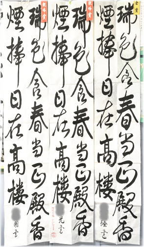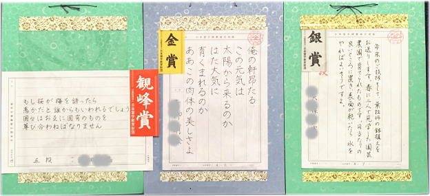 今年も、12月課題の書き初め競書が、観峰賞、金、銀、銅、努力賞の認定を受けて戻ってきました。イラストの画仙紙装は4種類。いつも白黒ばかりの教室が明るい色彩で華やかです。
