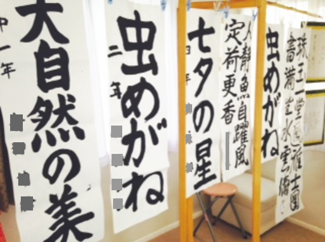 大きな紙を大きな下敷きに載せて太筆でかきますが、中心線・上下の空白・漢字とひらがなの文字の大きさのバランス・すぐなくなる墨汁等々、字形以外にも注意することがたくさんあって大変な難しさです。