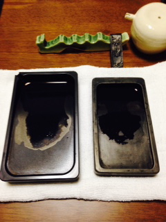 右の灰色の硯が石製400g、左の黒い硯が合成硯140gです。娘の習字セットに入っていた合成硯は驚きの80gでした。軽い!
