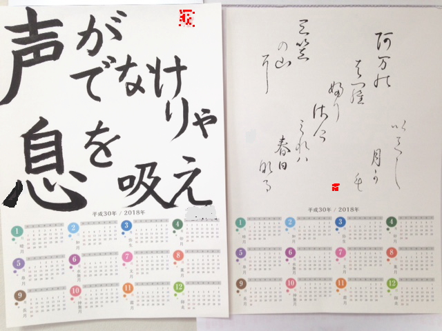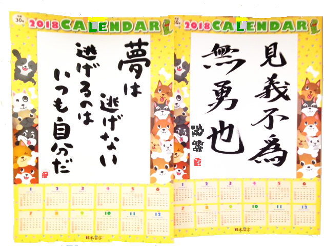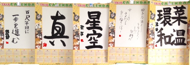 カレンダーに書くため、好きな書体・好きな言葉を自分で選び、自由に表現しました。作品の左側には名前と、赤で篆刻風に篆書した自分の名前をバランスを見て書き入れて完成です。