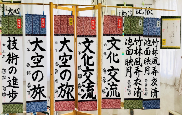 観峰・金・銀・銅・努力賞のいずれかがついていますが、どれもそれぞれに素晴らしい作品です。壁面に下げられるようになっていますので、小学校の夏休みの自由課題として提出したり、おじいちゃんおばあちゃんのおうちに持っていったり、自分の部屋に飾ったりして、お習字の作品として楽しんでください。