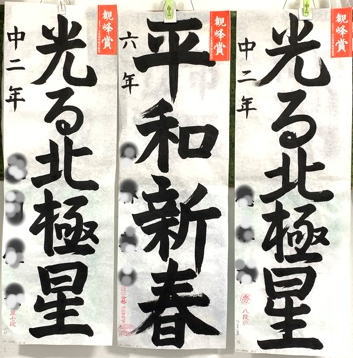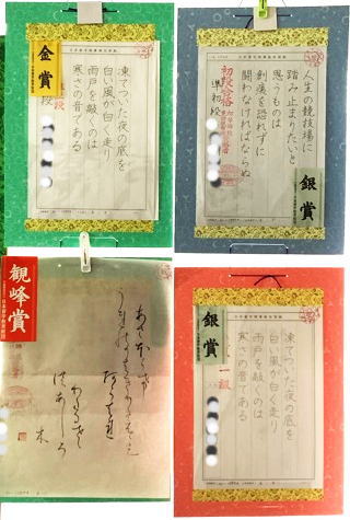 日本習字12月課題のかきぞめ競書が、観峰賞、金、銀、銅、努力賞の認定を受けて戻ってきました。この一年で生徒さんが増え、部屋の壁3面が書き初め作品で埋まってなかなかの迫力です。