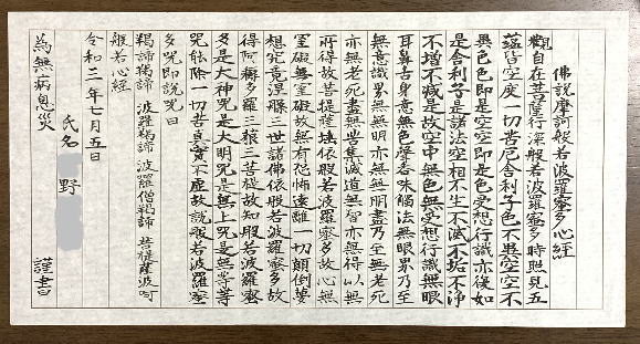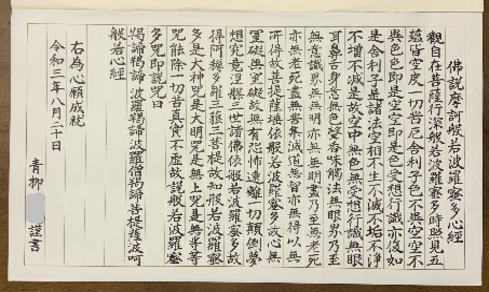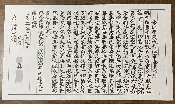 写経の最後には「無病息災」や「心願成就」などの願い事、日付、名前を書きます。常用漢字ではない文字を書いたり、読み方や意味などを知ったりと大変勉強になりました。
