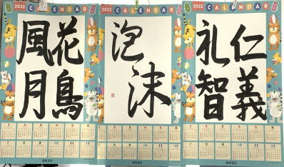イラストのあるカレンダーの白地は、検定半紙と同じサイズですので、気分を変えたくなったら検定作品を貼るのも良いと思います。