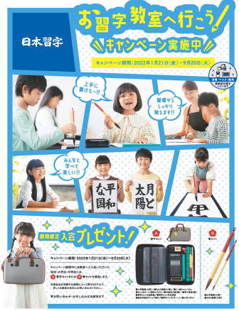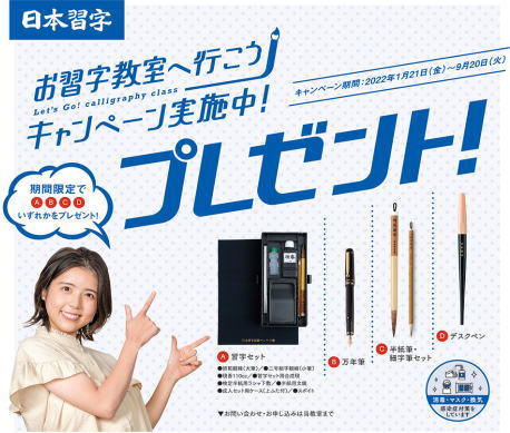 9月スタートまでにご入会の方には、お子様には↑左写真の、成人の方には右写真のお習字道具を差し上げます。ご入会前の体験教室にて教室の詳細を説明申し上げます。