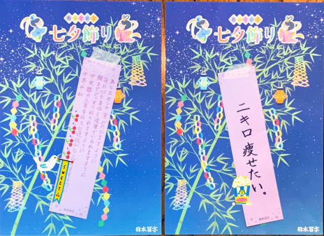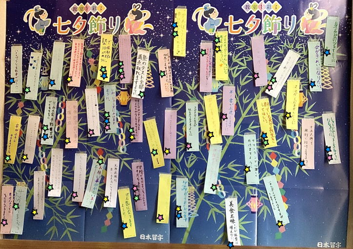 今までは教室内でしたが、今年は玄関に七夕の短冊を飾ってみました。6月始めごろから毎週自分の願い事を見ているうちに「追加であと二つ思いついた」方あり、「やっぱり違う願い事にする」方ありと増えたり減ったりした短冊を、七夕直前の稽古日に家でも飾って楽しんでいただけるように、お1人分ずつ台紙に貼ってお返ししました。