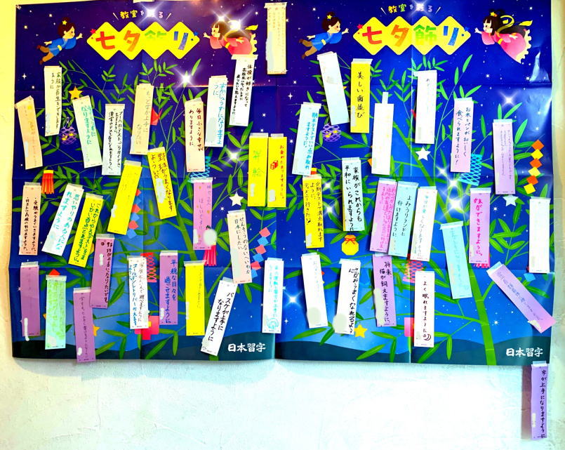 今年も玄関の壁に七夕の短冊を飾りました。健康とコロナ終息を願うものが多かった昨年に比べて、今年は自分がどうなりたいか、何をしたいか、何が欲しいか、目標を実現させるための決意表明的な願い事が多かったように思います。