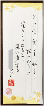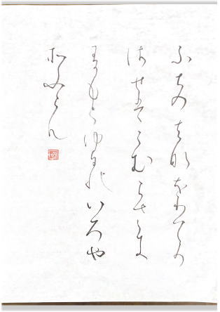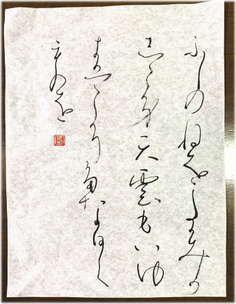 名前の一文字を1.2㎝×1.2㎝の石に掘って、仮名作品・くらしの書課題などを書いて印を押しました。篆刻印を押すことで、練習用紙から「作品」へと格上げされます。