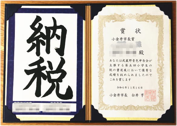 ↓小学5年生の生徒さんが受賞されました。作品のコピーもついてとても立派な額です。2024年で第5回目の武蔵野青色申告会主催「小学生の税の書道展」で小金井市長賞でした。夏休みに頑張った甲斐がありましたね。
