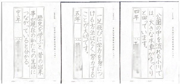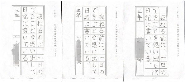 ↓日本習字硬筆展の賞状と作品です。何度も同じ課題を練習するため、文字の癖(クセ)が矯正され、参加した生徒さんは硬筆が大変上達しました。そのまま上手でいるためには教室でだけでなく、普段から整った文字を書くように意識すると良いですね。