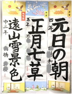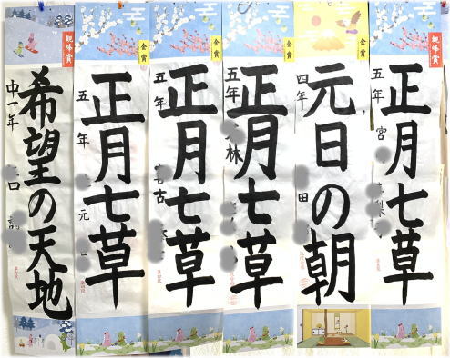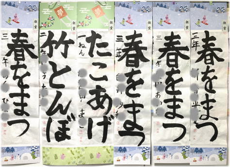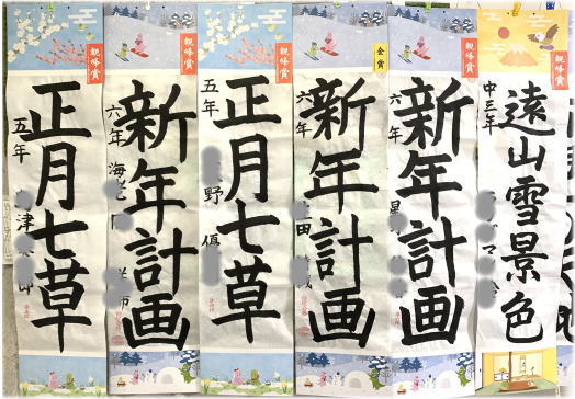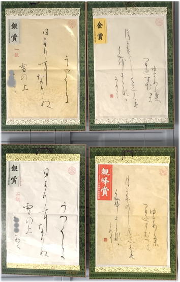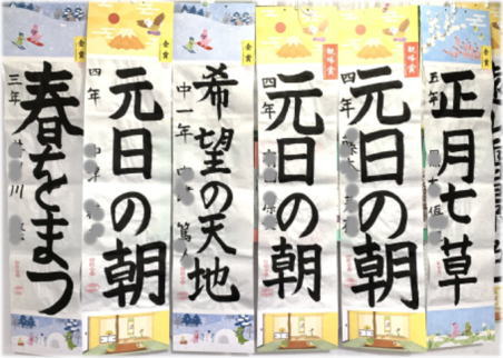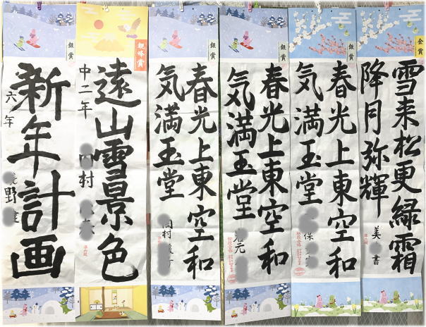 今年も、12月課題の書き初め競書が、観峰賞、金、銀、銅、努力賞の認定を受けて戻ってきました。イラストの画仙紙装は4種類。いつも白黒ばかりの教室が明るい色彩で華やかです。